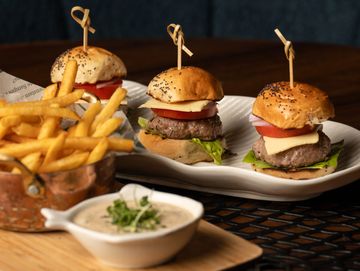 Tres mini cheeseburgers, side de salsa e hongos y papas fritas • Three mini cheeseburgers , side of mushroom sauce and fries