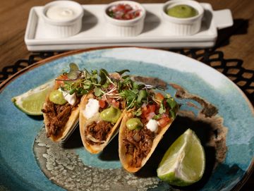 Tortilla de trigo, ropa vieja, pico de gallo, picante de la casa, crema agria. • Corn tortillas, beef ropa vieja, pico de gallo, creamy hot sauce, sour cream.