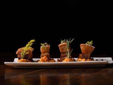 Con salsa de especias orientales, puré de batata a la naranja, cilantro y miel - Crispy pork belly served on a bed of orange sweet potato puree , cilantro and honey.